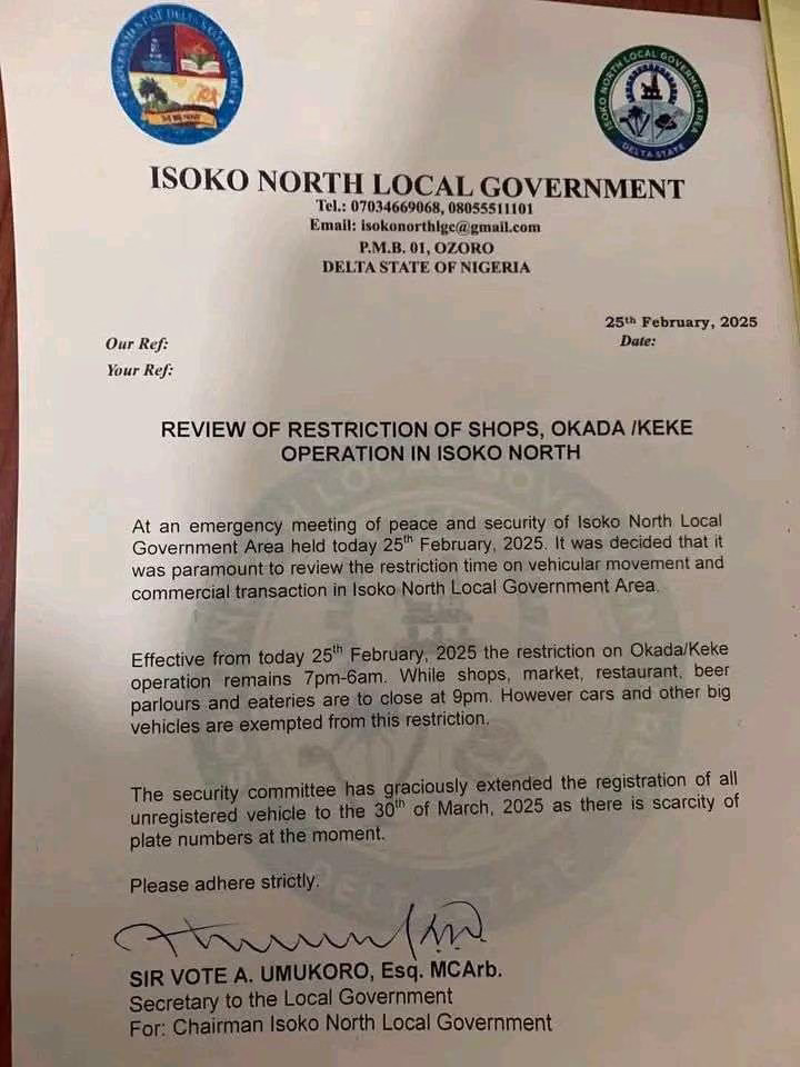 Isoko North Reviews Restriction on Shops, Okada, and Keke Operations
